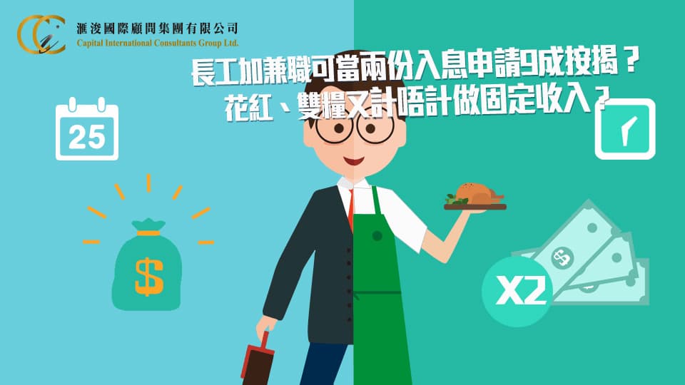 如果「固定兼職」,有報稅,申請按揭時可將相關收入計算作入息。經常有人問:「一份長工,一份兼職,可否計足兩份入息?」只要長工僱傭合約寫明准許兼職,可照申請八成按揭;惟公務員不准兼職,所以沒有這支歌仔唱。申請一般按揭時,租金收入可以計算入息,但要打七折。